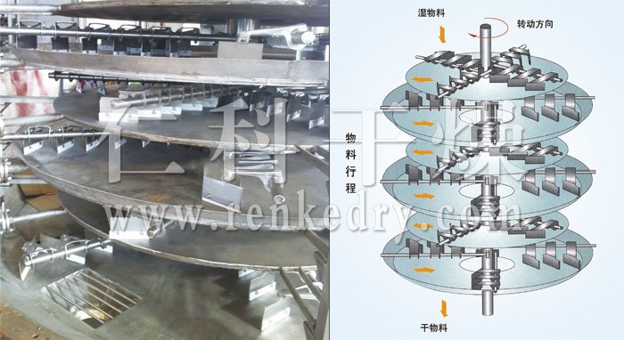 - The drying efficiency can be improved by adjusting the thickness of material layer, rotary speed of main shaft, quantity of harrow arm, shape and size harrow plates.